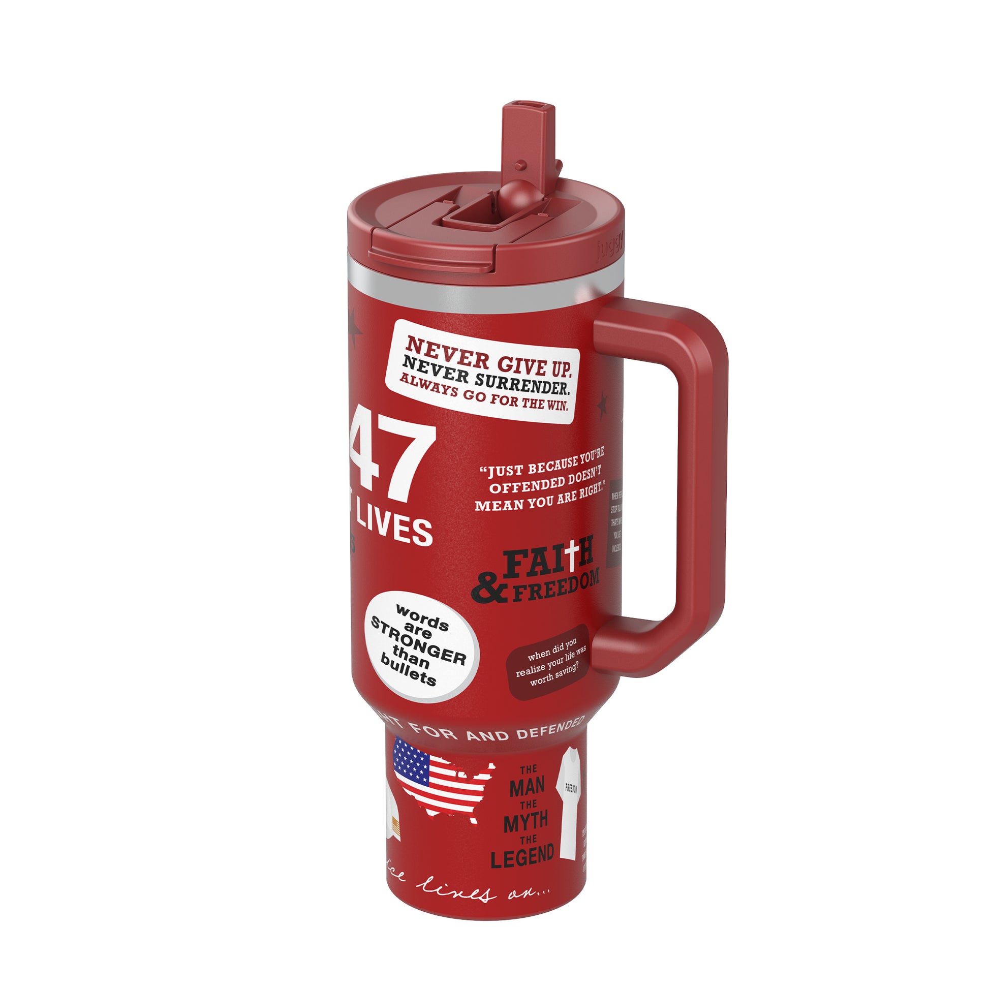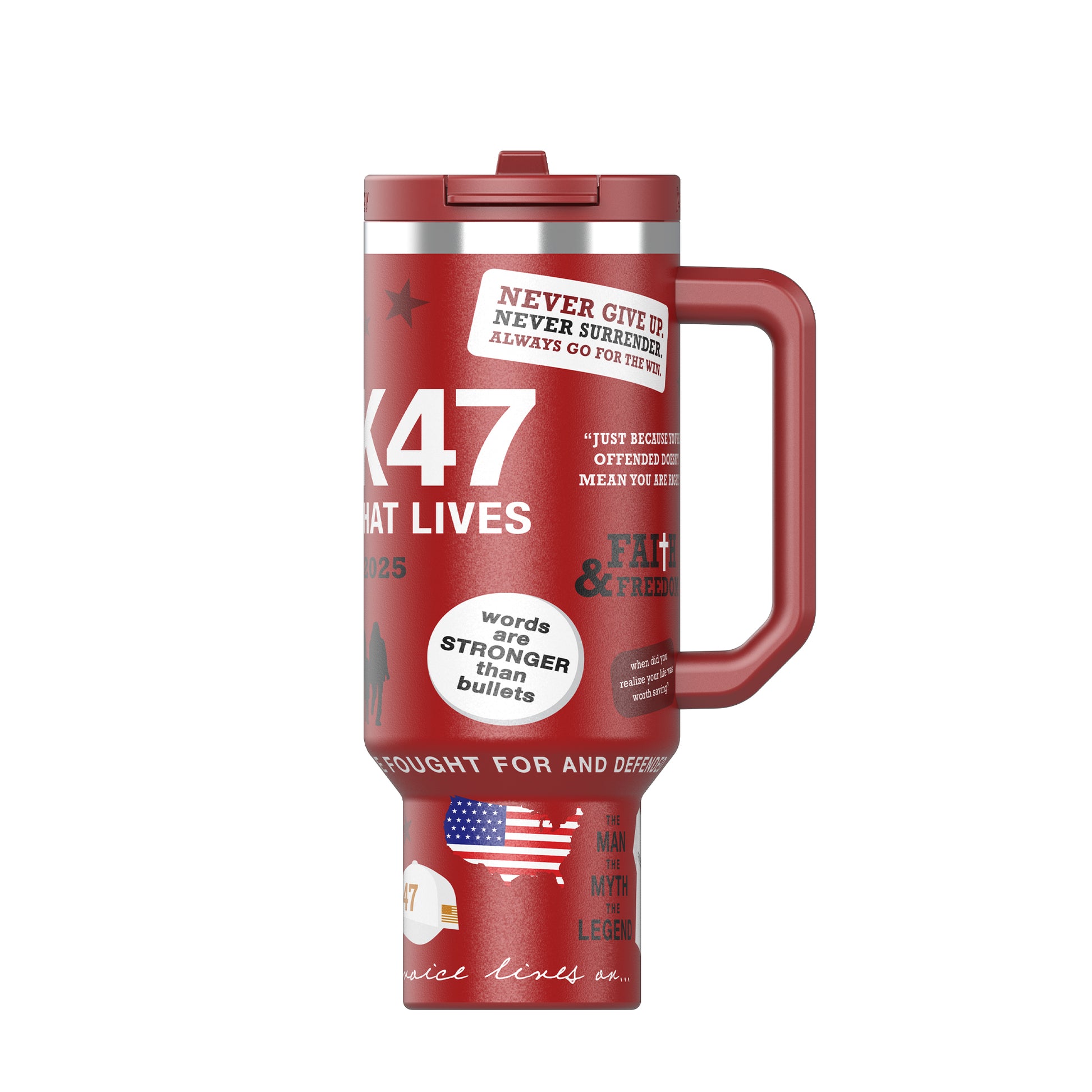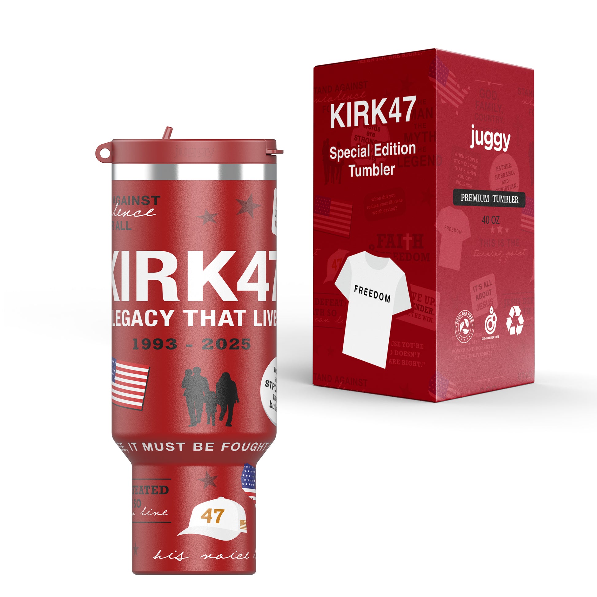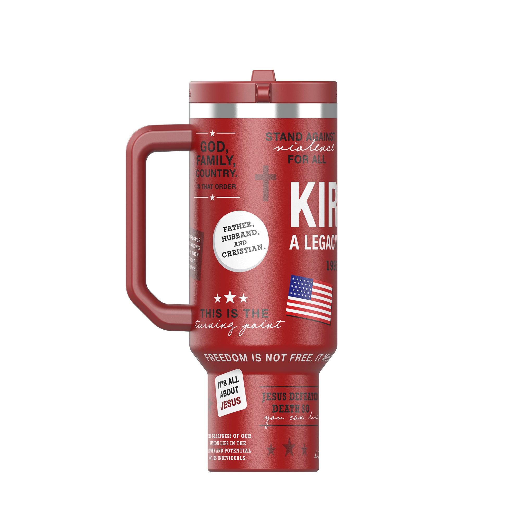 Sip with purpose. This limited-edition 40oz commemorative tumbler pays tribute to American patriot and leader Charlie Kirk, celebrating his vision, voice, and the values he stood for. Built for durability and designed for everyday use, this tumbler keeps your drinks ice-cold or piping hot while serving as a daily reminder to live boldly and stand firm in your beliefs.