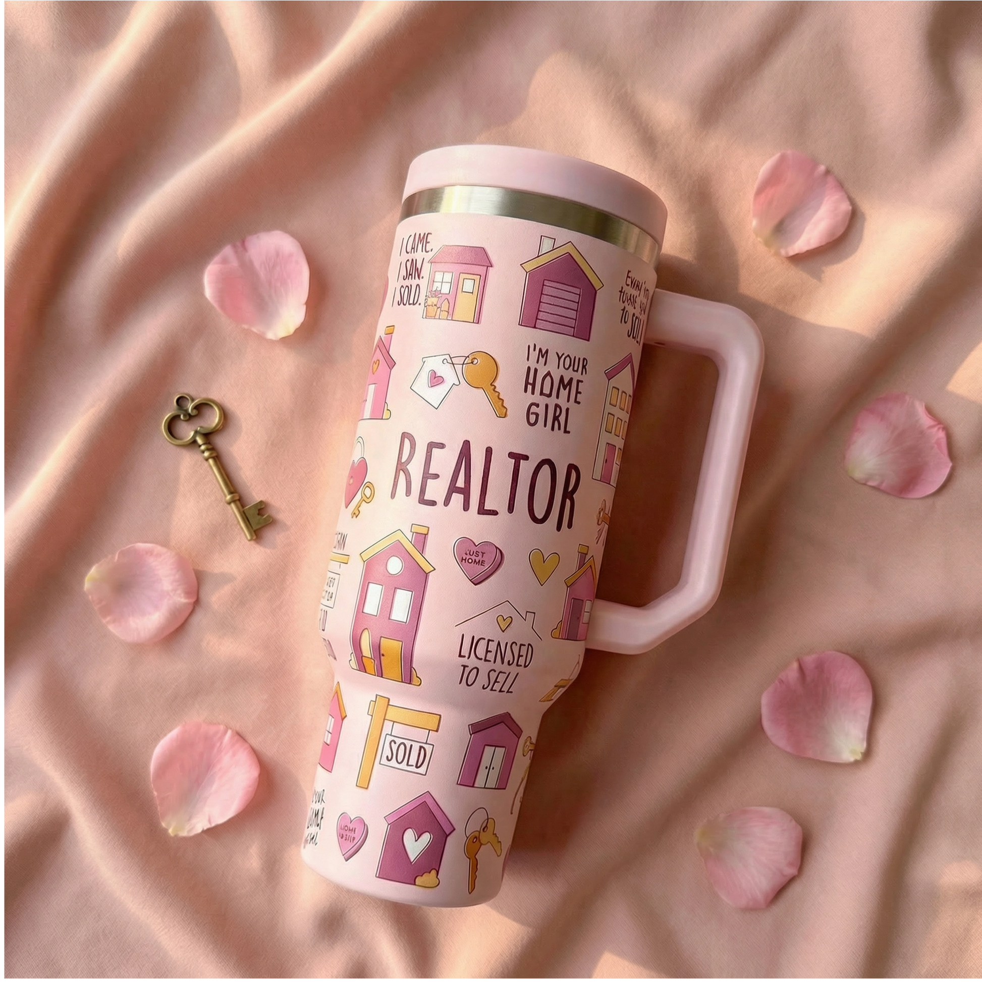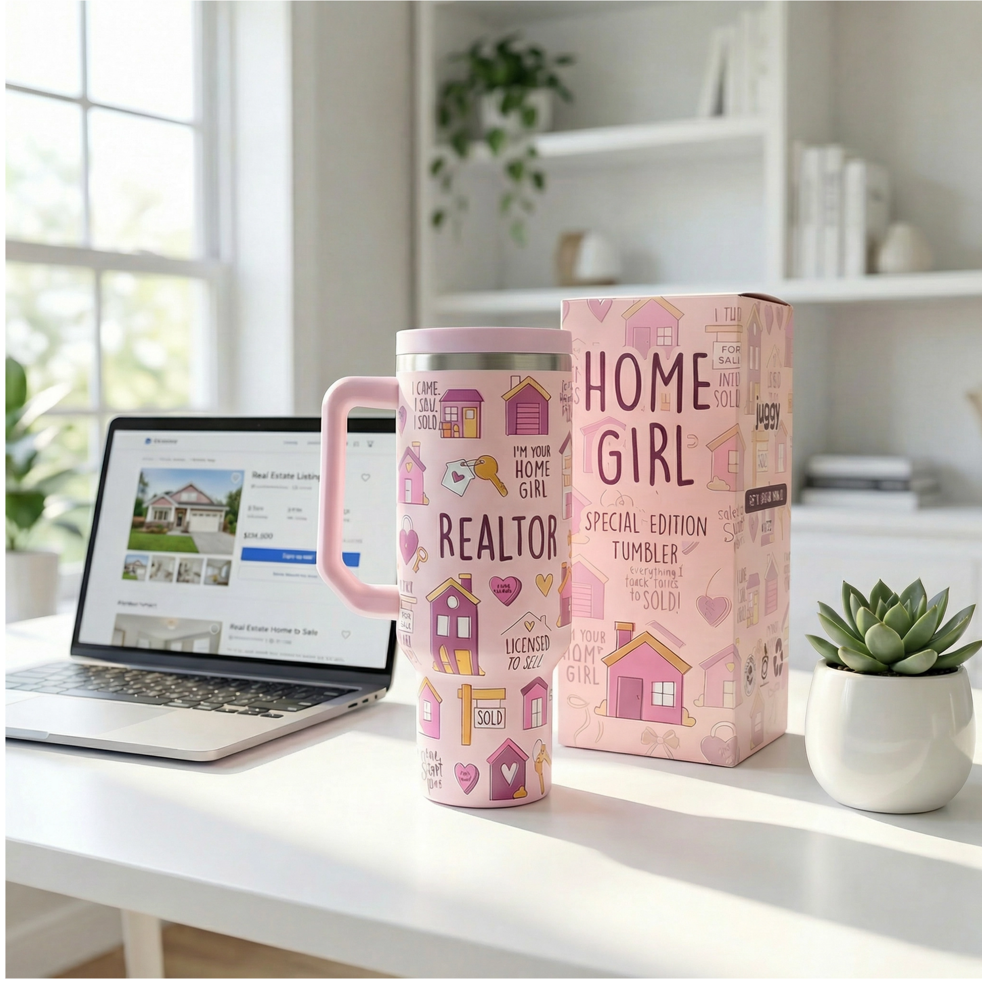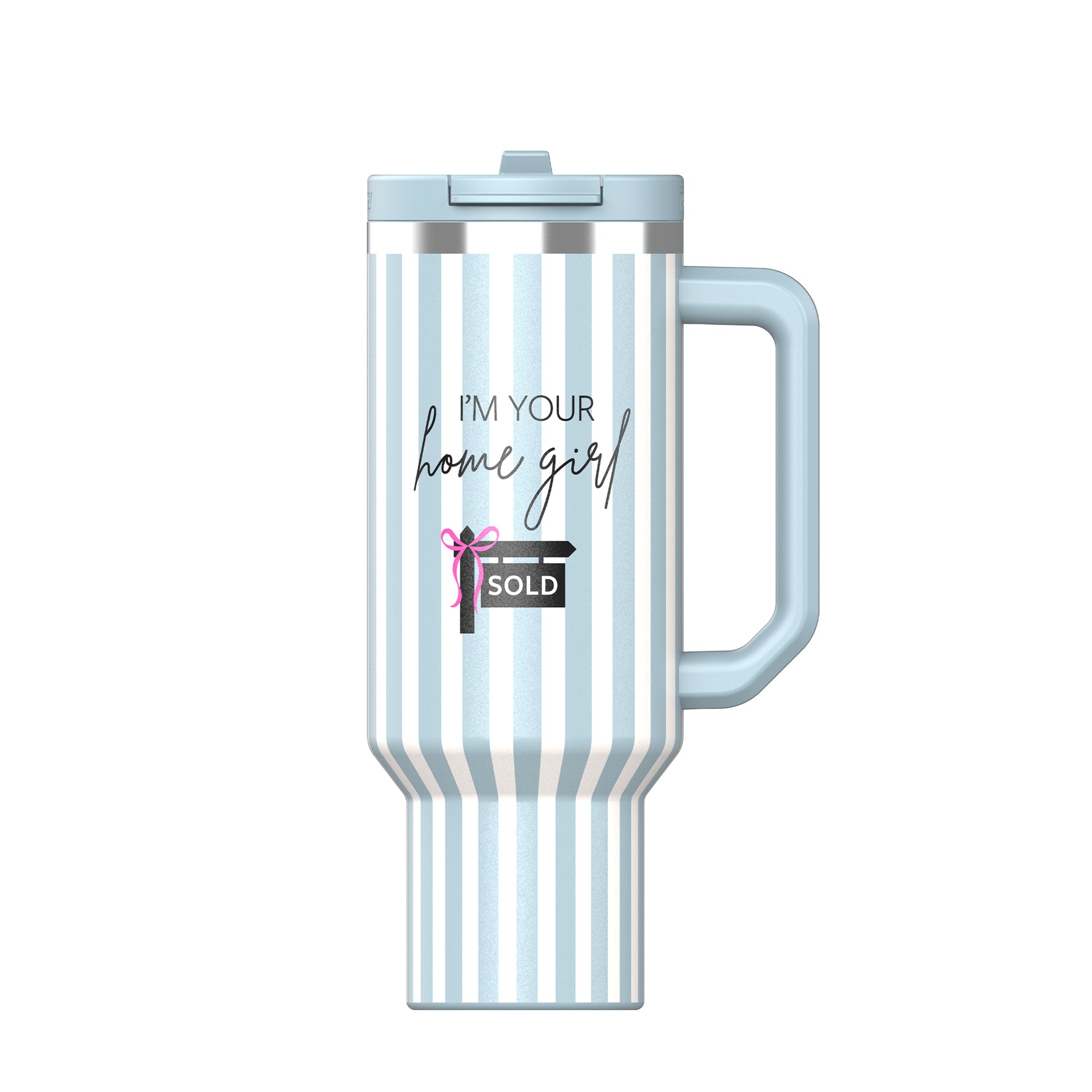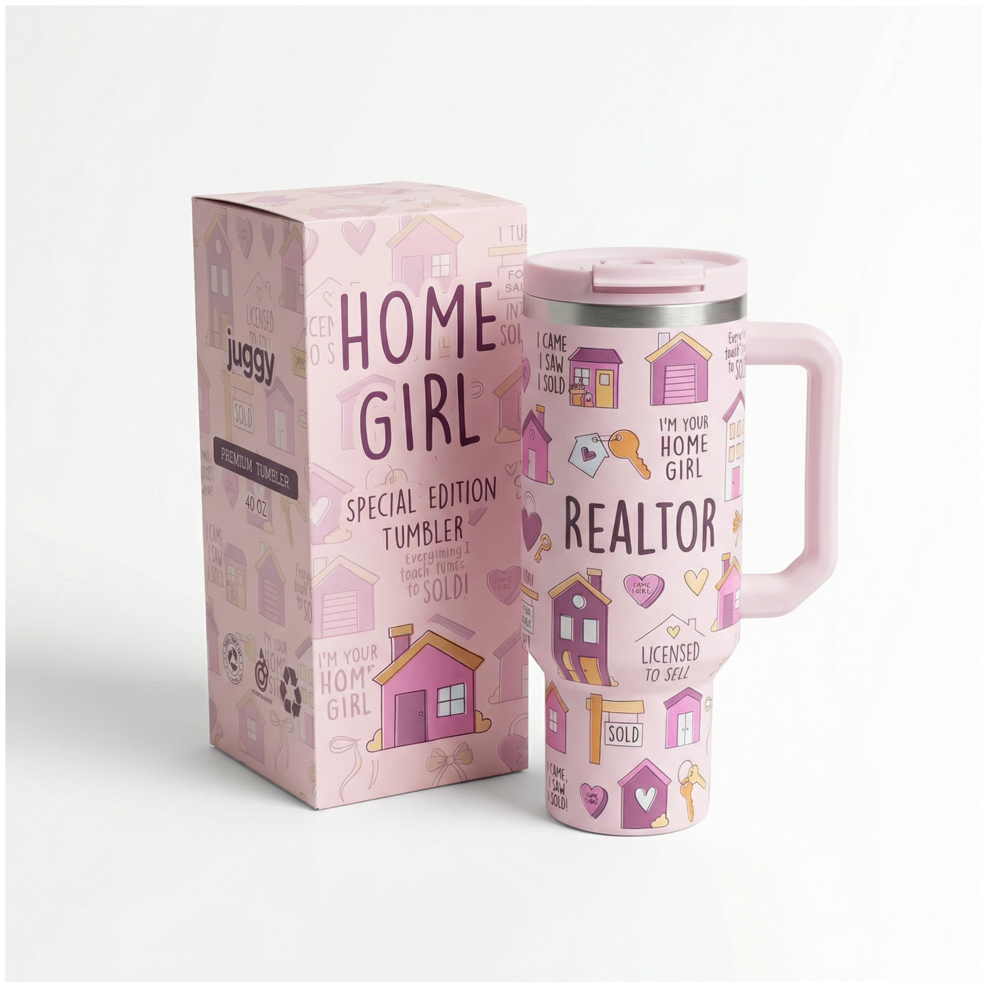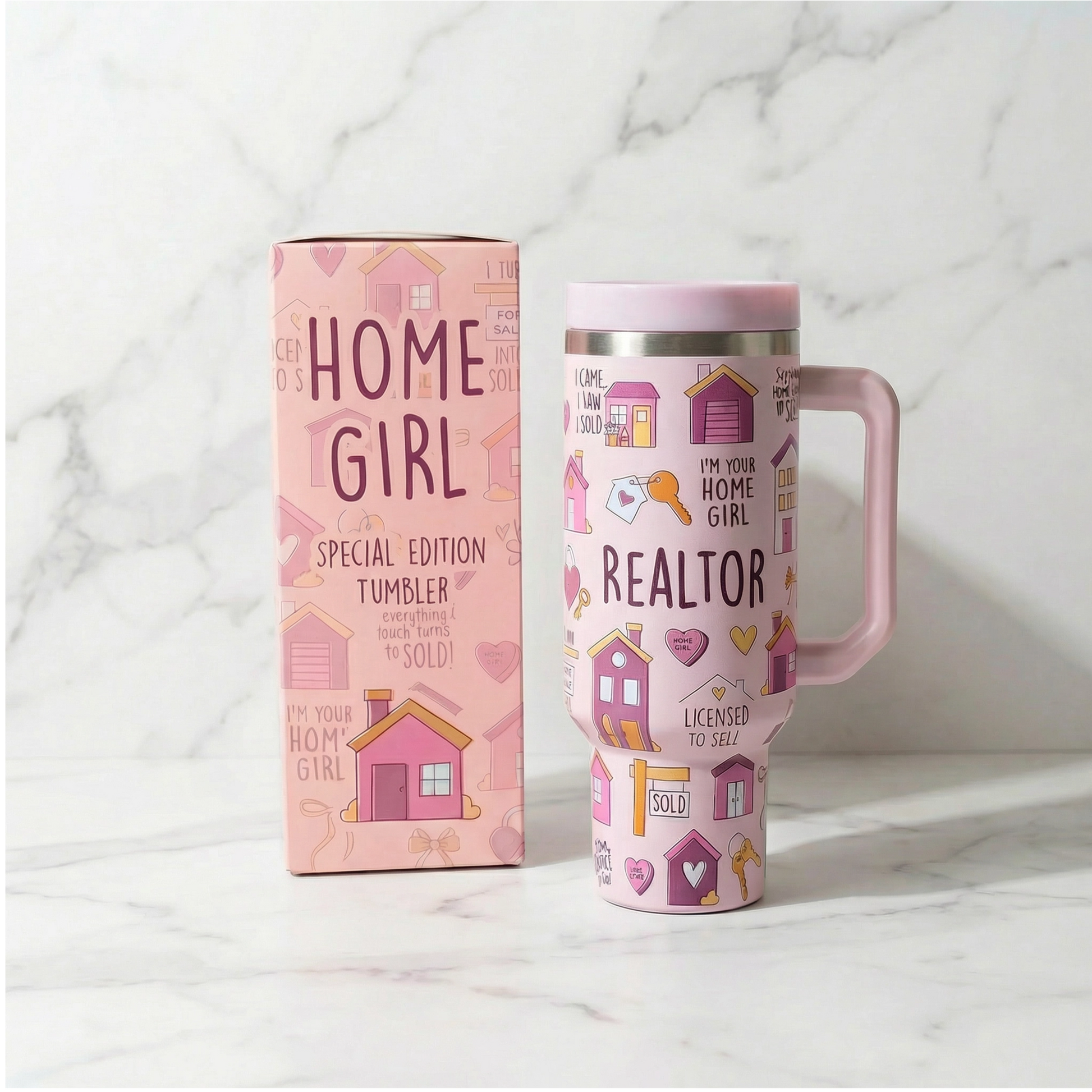 Stay hydrated in realtor style with the Home Girl 40oz DuoLid Tumbler! Made of sturdy stainless steel, this water tumbler comes with 4 realtor themed croc charms that attach to the lid. Quench your thirst (and get potential leads 😉) with this fun and functional tumbler you can't get anywhere else.