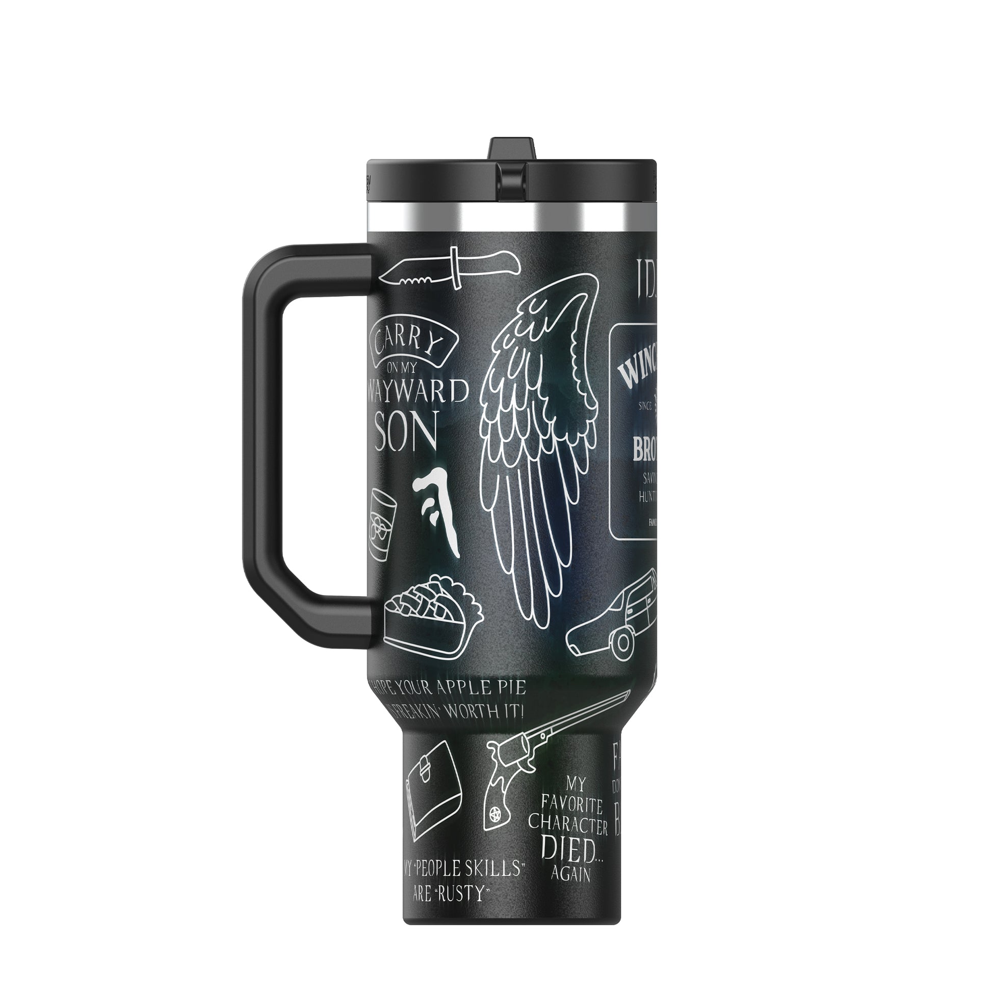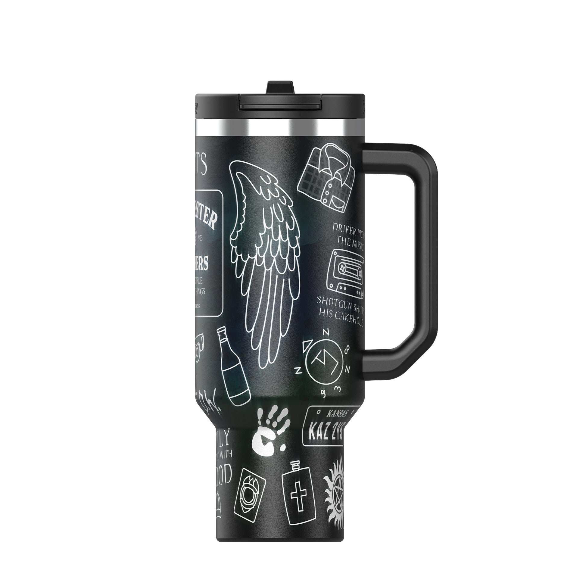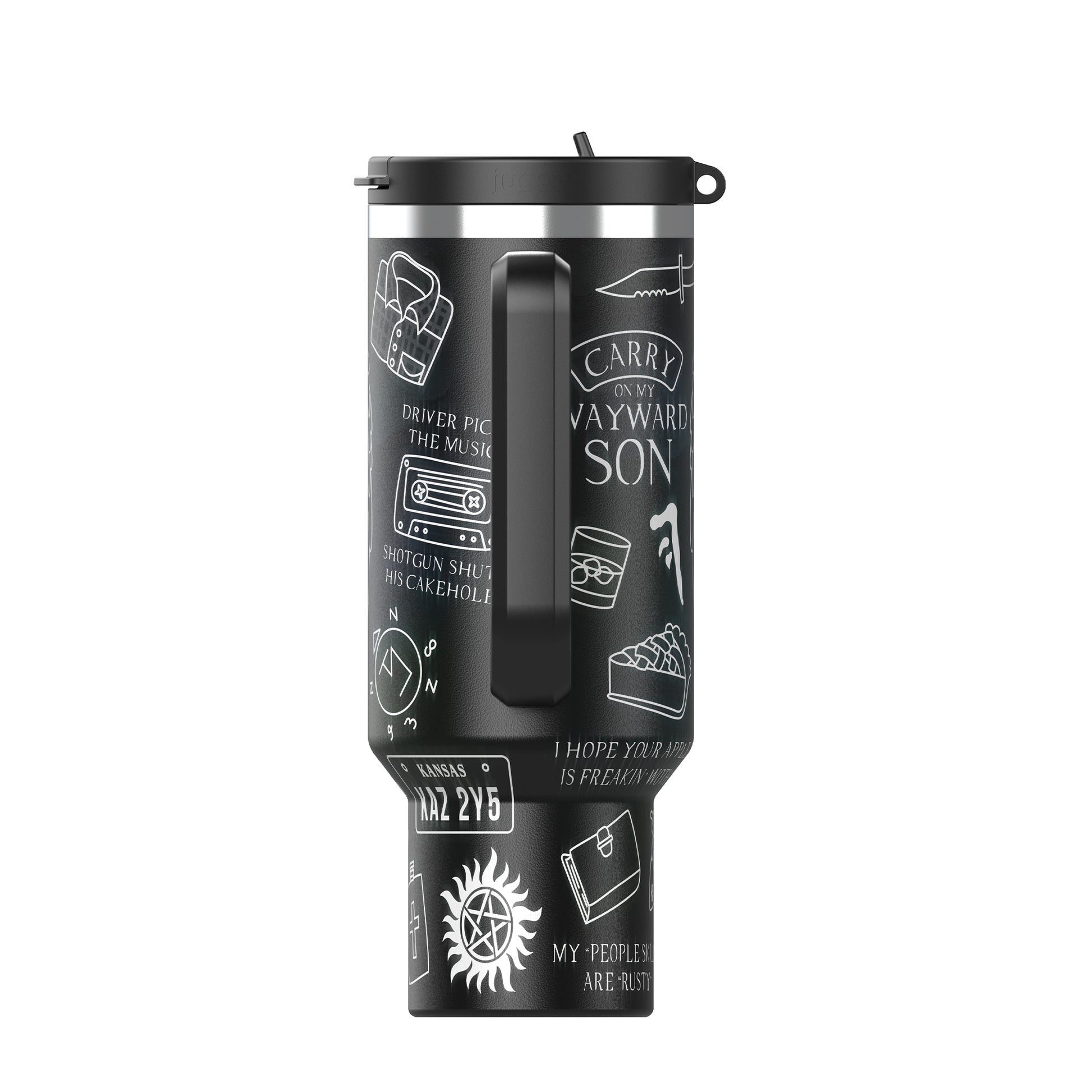 Carry the Supernatural 40oz Tumbler and keep your energy hella high through every late-night hunt and road trip. Built for those who live by “Driver picks the music, shotgun shuts their cakehole,” this bold statement piece fuels every mission — from chasing monsters to conquering Mondays.